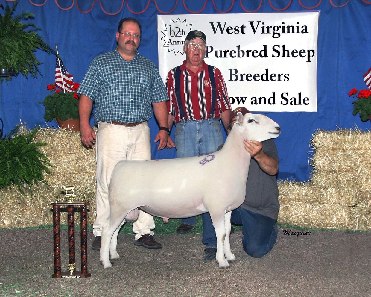 PICTURED WITH JUDGE BRAD KASLER FRON OHIO, MACQUEEN AND ROBBIE McNABB HOLDING. I HAVE BEEN VERY FORTUNATE IN BEING ABLE TO HAVE ROBBIE HANDLE OUR SHOW AND SALE SHEEP. HE HAILS FROM OUR OLD HOME COUNTY IN WEST VIRGINIA AND IS A VERY PROFESSIONAL SHEEP SHEARER AND SHOWMAN. I KNEW HIS DAD WELL. BOB SADLY DIED MUCH TOO YOUNG AND WAS A GOOD SHEEP MAN LIKE HIS SON.