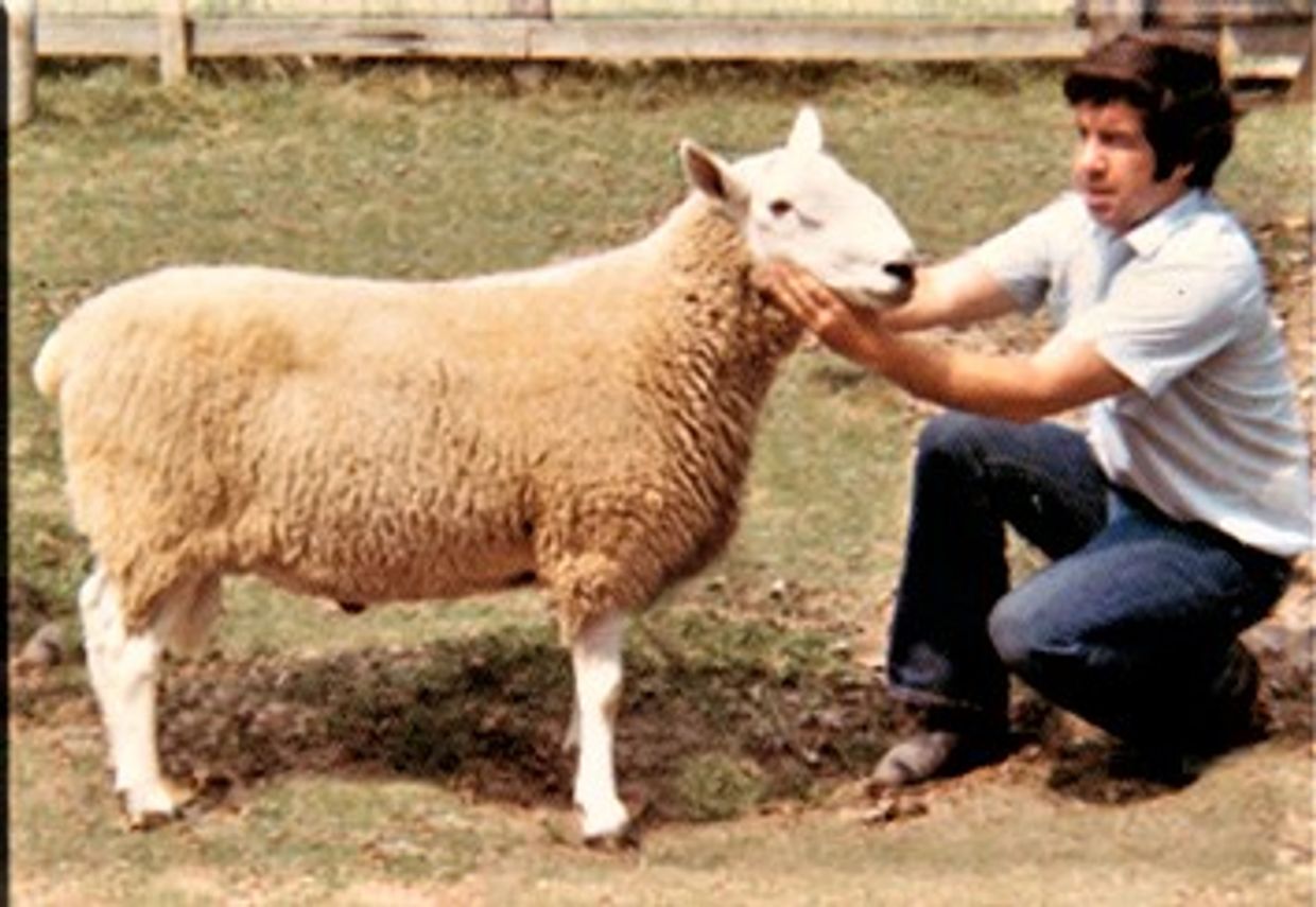 Above is pictured the Champion North Country Cheviot ram, 1968 Canadian Royal, top seller, Sale of the Stars. From left to right, myself, Stan Bagg, breeder, my girlfriend Merrilyn from Australia, and Stan's handler.